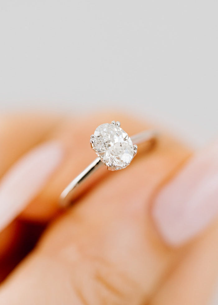 With a subtle uniqueness, the Eden is a contemporary hidden halo engagement ring. Crafted in 14k white gold, the Eden features a .98ct oval cut light salt and pepper diamond secured by four double prongs and set above a 12-stone diamond pave hidden halo. A simple oval engagement ring doesn’t have to be boring, and the Eden proves that.