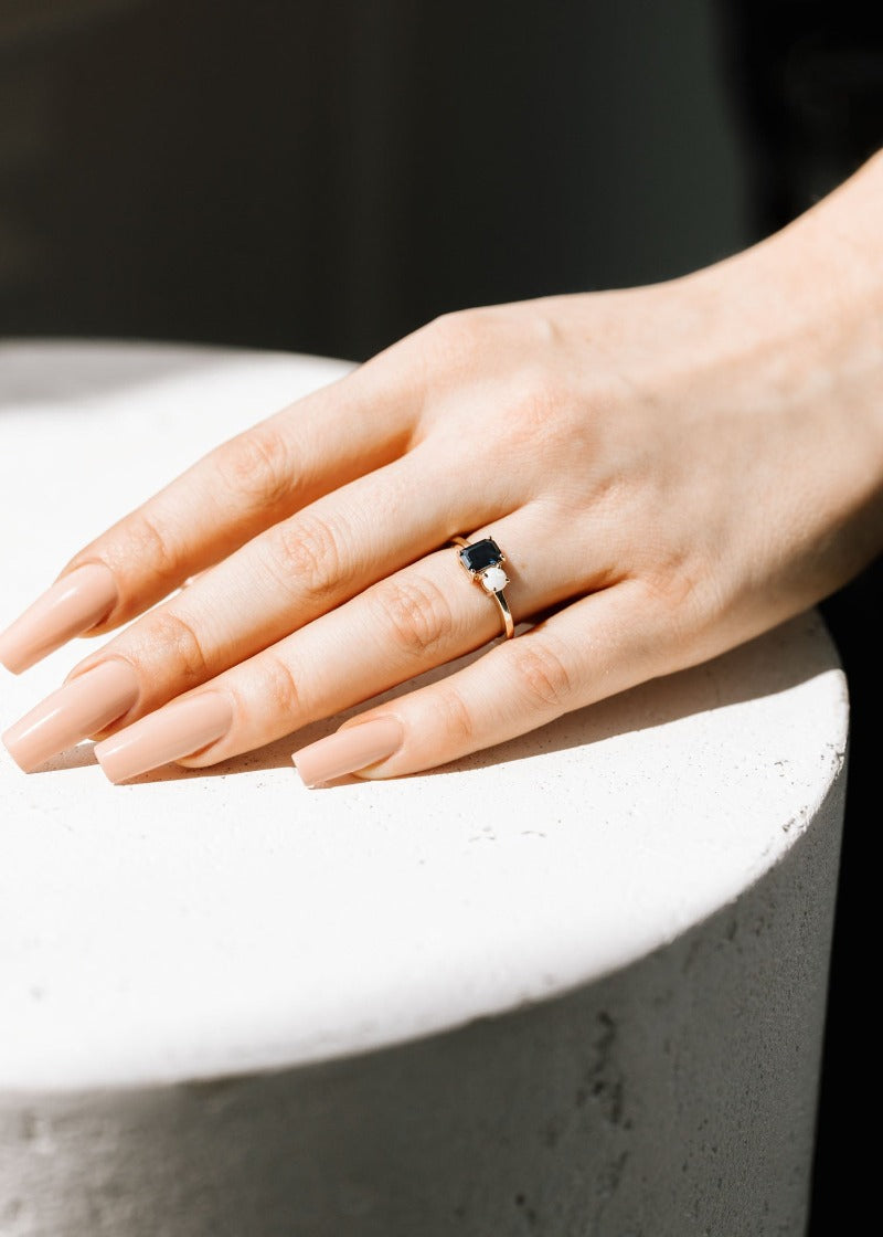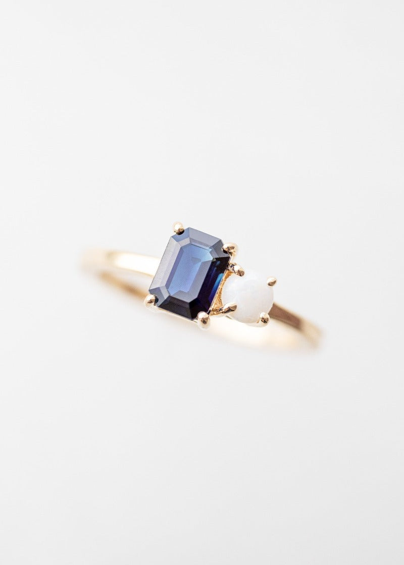 The Vela Ring | 1.09ct Emerald Cut Sapphire + .18ct Round Opal | Yellow Gold