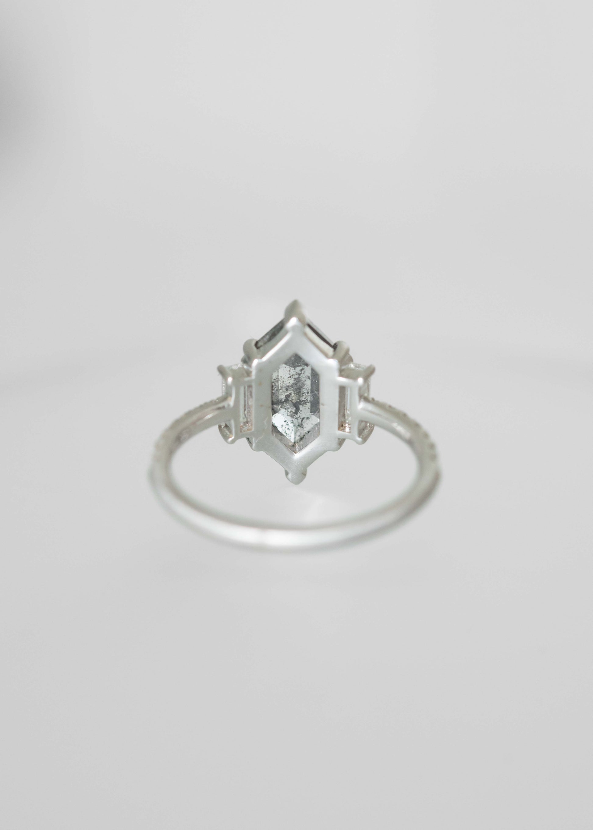 18K White Gold • 1.55ct Hexagon Salt and Pepper Diamond • Baguette + Pave Band