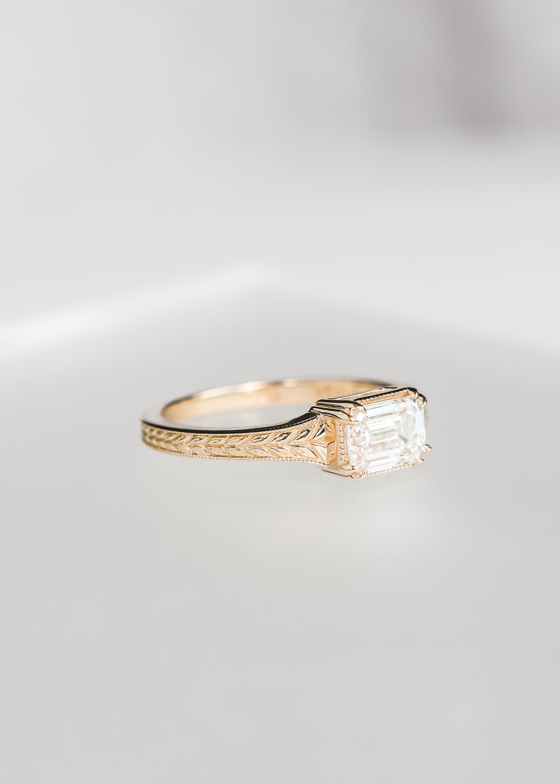 The elongated emerald cut gives this piece a clean, open sparkle while the geometric faceting adds a mirror-like brilliance. The band is adorned with delicate wheat-style engraving and fine milgrain edges, lending depth, texture, and old-world elegance to the ring. Every detail is designed to celebrate craft, clarity, and commitment.