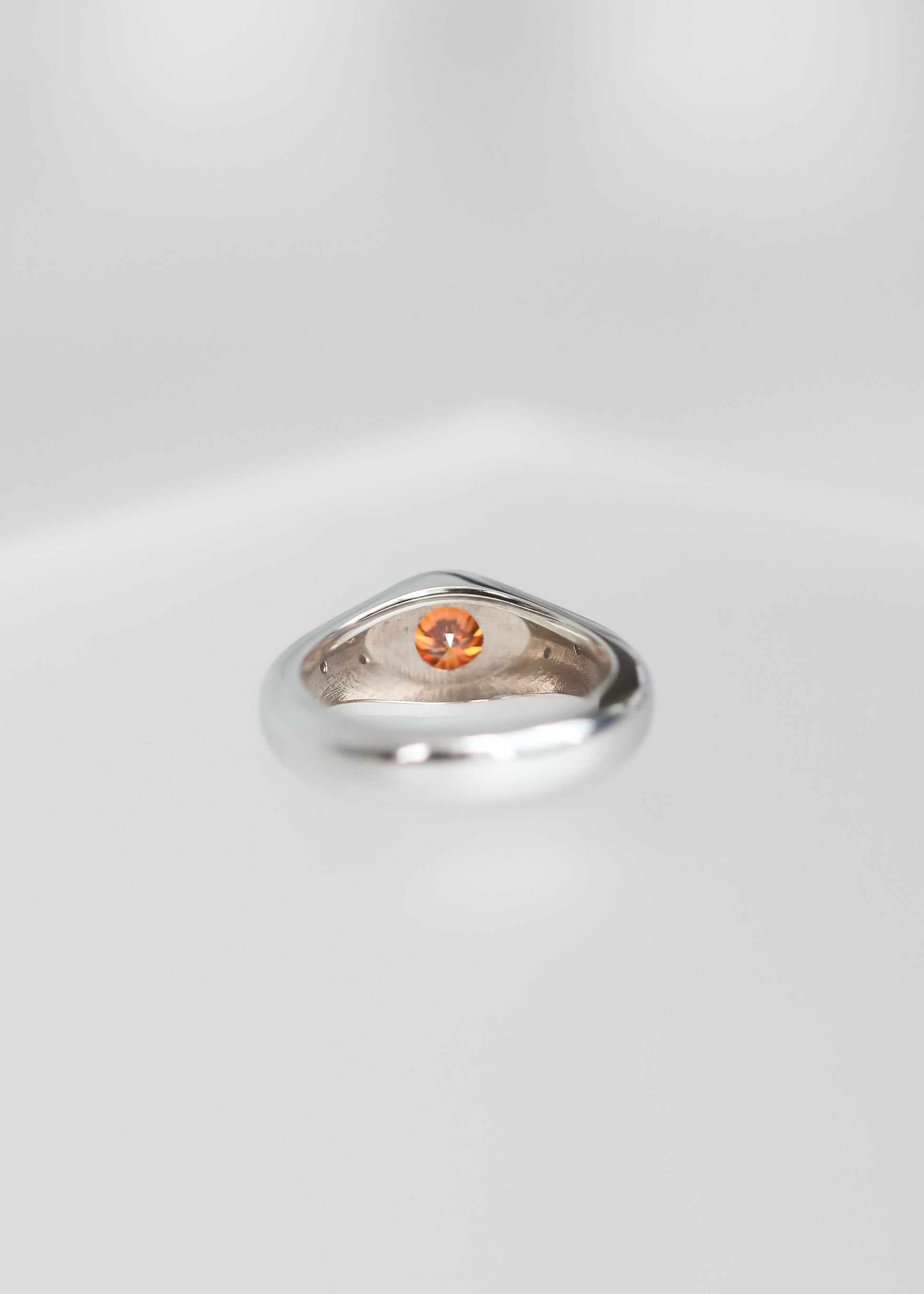 A bold take on a classic signet silhouette, this Vulcan ring features a 0.74ct round orange moissanite that glows like embers at the center of a polished 14K white gold band. Scattered star-set diamonds bring a celestial sparkle to the high-shine surface, while the rich orange hue of the center stone brings heat, energy, and individuality. A statement ring with serious soul.
